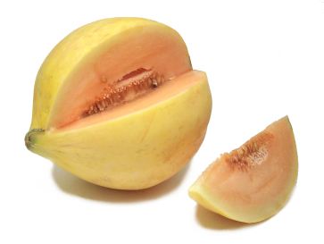 Crenshaw Melons can weigh up to ten pounds and deliver a unique sweet and spicy flavor. They are a hybrid between the Casaba and Persian melon with a yellowish skin and salmon colored flesh. Peak season for Crenshaw melons is August through September, with the fruit season beginning in July and ending in October.