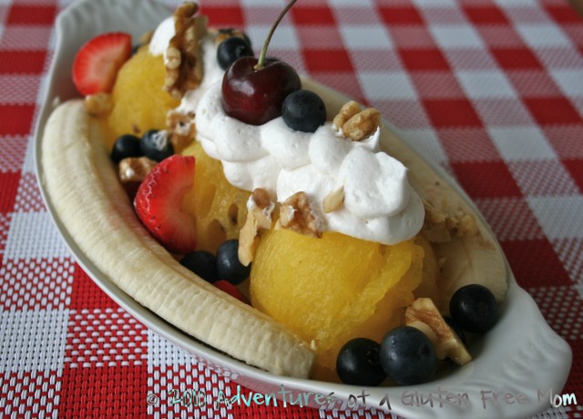 I saw this in a magazine and for the love of Pete, I cannot remember where I saw it. The “ice cream” is simply yellow watermelon that I scooped out with an ice cream scooper. I then added banana slices, fresh sliced strawberries, whole blueberries, dairy-free whipped cream (Healthy Top by MimicCreme), chopped walnuts and finished it off with a fresh cherry (they look quite a bit different from the dyed marachino cherries, but my kids didn’t miss a beat!). Speaking of which, do you know how they make maraschino cherries? The Chow article I just linked to also links to a couple of homemade Marachino cherry recipes that might come in handy sometime.