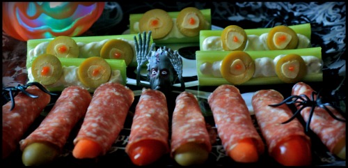 The “Eyeballs on a Log” were my spooky spin on “Ants on a Log.”  I filled the celery stalks with cashew cream cheese then topped with a couple sliced garlic stuffed olives (my kids are not fans of pimento stuffed olives).  With all the green and beige coloring, I felt it need a little pop of red.  Using a toothpick, I dabbed on some pizza sauce in the center of each garlic for a red iris.