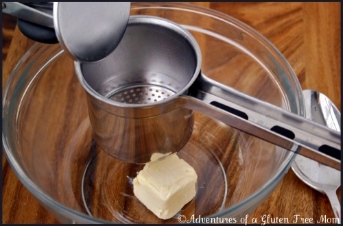 I like to rice the warm potatoes over the Earth Balance so it will begin melting.ย If you avoid corn, a healthy oil works just as well, but I just drizzle it on top of the already riced potatoes.