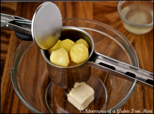If you do not have a potato ricer, I cannot encourage you enough to buy one.ย I first started using one a couple of years ago and without a doubt, a ricer makes THE BEST mashed potatoes!ย No lumpy potatoes like you can get with a traditional potato masher.ย No gluey potatoes like you can get if you over-whip with a mixer.ย A potato ricer makes perfectly light and fluffy mashed potatoes every time.ย I have this ricer: Oxo Good Grips Potato Ricer and I have been very happy with it.ย The Oxo ricer has a small hopper, so if you are feeding a large crowd, Williams Sonoma sells one with an extra large hopper.