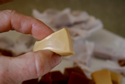 - Use a buttered knife to cut into 1-inch squares. Wrap each piece in waxed paper or plastic wrap. Store at room temperature.