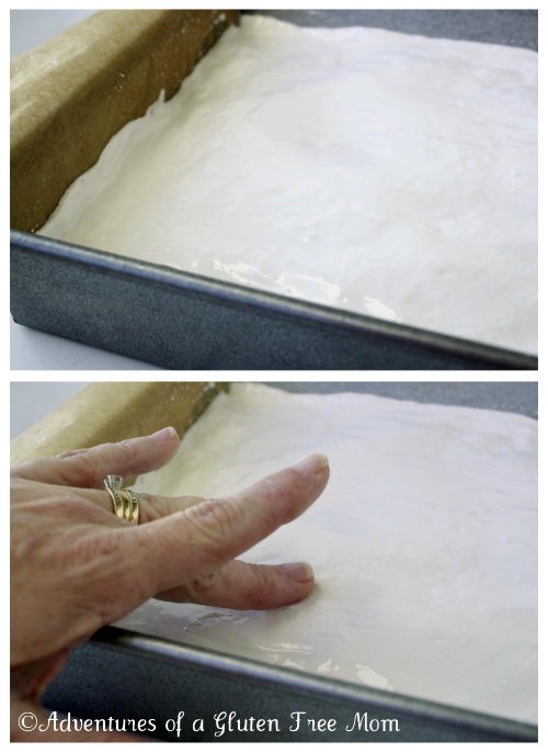 After plopping the marshmallow cream into a 9 x 9 parchment lined pan, I smoothed out the top of the marshmallows with damp fingers.