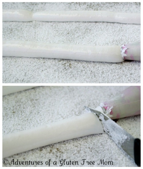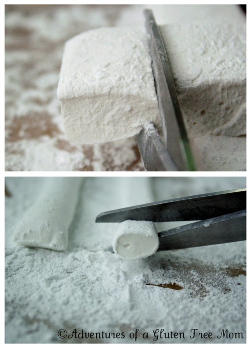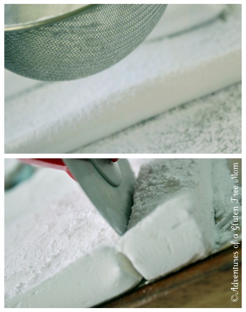Dust marshmallows with corn-free powdered sugar, then allow to cure for several hours before cutting.ย I used a pizza wheel to cut strips of the thicker marshmallows.