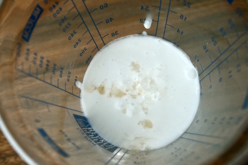 2. Add both coconut milks, apple cider vinegar and sea salt to a small bowl or measuring cup and allow to sit for about 10 minutes until mixture becomes a little lumpy.